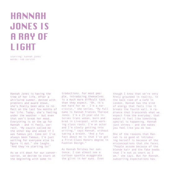 We’re proud to share the full Hannah Jones Is A Ray of Light editorial here on F Word Online, giving this story a permanent digital home now that the print issue is nearly gone. To hold one of the last remaining 4 copies in your hands, you can purchase it HERE.