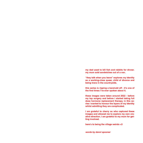 Danni Spooner’s photographic series they talk when you leave is deeply layered, both in form and in feeling. Shot in 2022 — before top surgery and before starting full-dose hormone replacement therapy — the work sits with a version of self that is still becoming.